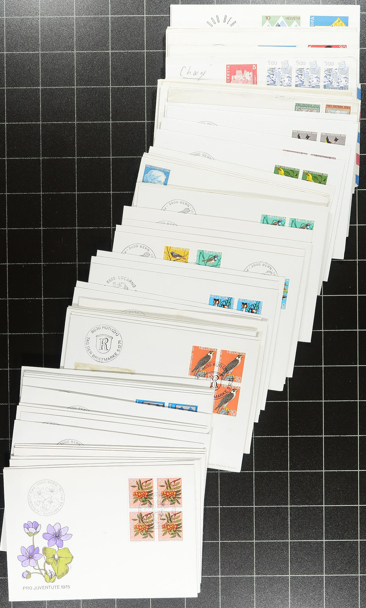 Postal History collection / accumulation of roughly 400 Switzerland covers, 1940's-1990's, loose in a box. The vast majority of material are first day covers, noting singles, sets, pairs, and souvenir sheet frankings, along with a few first flights, commercial covers, a few registered covers, and postal stationery, along with a wide range of pictorial cancels and bridge town postmarks. A nice clean lot of this popular collecting region for cover collectors and topical / thematic collectors as we note a good variety of suitable subjects. Overall fine to very fine. Estimate =