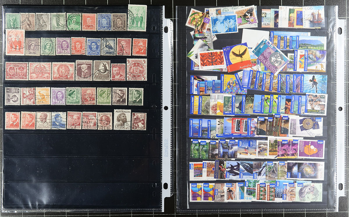 Accumulation of used Australia, 1913-2010, containing roughly 1,500 stamps in over 20 stock or album pages. The lot generally ranges from Scott #1/3288, including back of the book issues, noting roughly 40 Kangaroo issues, several KGV Heads, a decent selection of modern issues, and more. A spot check indicated some singles and sets cataloguing $10 to $20 and up, with owner's 2018 Scott catalogue value for the lot totaling US$1,598.00, leaving better finds for the dedicated collector. A nice lot that is fairly well organized, overall fine to very fine. Estimate =