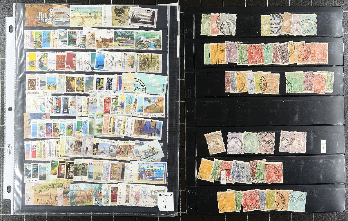 Accumulation of used Australia, 1913-2010, containing roughly 1,500 stamps in over 20 stock or album pages. The lot generally ranges from Scott #1/3288, including back of the book issues, noting roughly 40 Kangaroo issues, several KGV Heads, a decent selection of modern issues, and more. A spot check indicated some singles and sets cataloguing $10 to $20 and up, with owner's 2018 Scott catalogue value for the lot totaling US$1,598.00, leaving better finds for the dedicated collector. A nice lot that is fairly well organized, overall fine to very fine. Estimate =