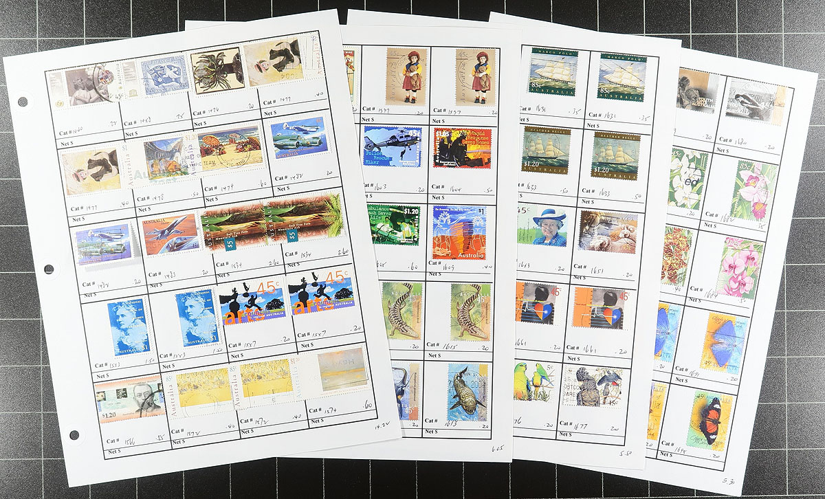 Accumulation of used Australia, 1913-2010, containing roughly 1,500 stamps in over 20 stock or album pages. The lot generally ranges from Scott #1/3288, including back of the book issues, noting roughly 40 Kangaroo issues, several KGV Heads, a decent selection of modern issues, and more. A spot check indicated some singles and sets cataloguing $10 to $20 and up, with owner's 2018 Scott catalogue value for the lot totaling US$1,598.00, leaving better finds for the dedicated collector. A nice lot that is fairly well organized, overall fine to very fine. Estimate =