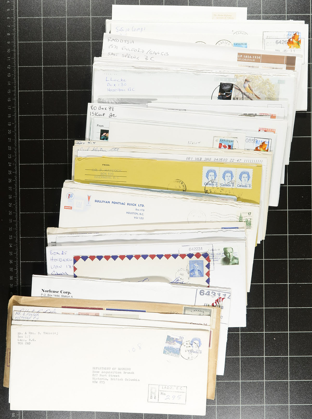 British Columbia Postal History. Accumulation of roughly 550 covers collected for British Columbia town postmarks,1920's-1990's. A cursory check indicated a few hundred different towns ranging from A to V, including Anahim Lake, Tomslake, Tod Inlet, Toad River, Tatlayoko Lake, Thetis Island, Ta-Ta Creek, and much more. Postmark interest includes cds, duplex, broken circle, slogan, machine, Klussendorf, along with Delta, Richmond, and Surrey 'Specialty' cancels, sub offices, and more. Some duplication with some larger towns, along with some corner advertising envelopes, various frankings, etc. A nice lot for the British Columbia town postmark collector, overall fine to very fine. Estimate =