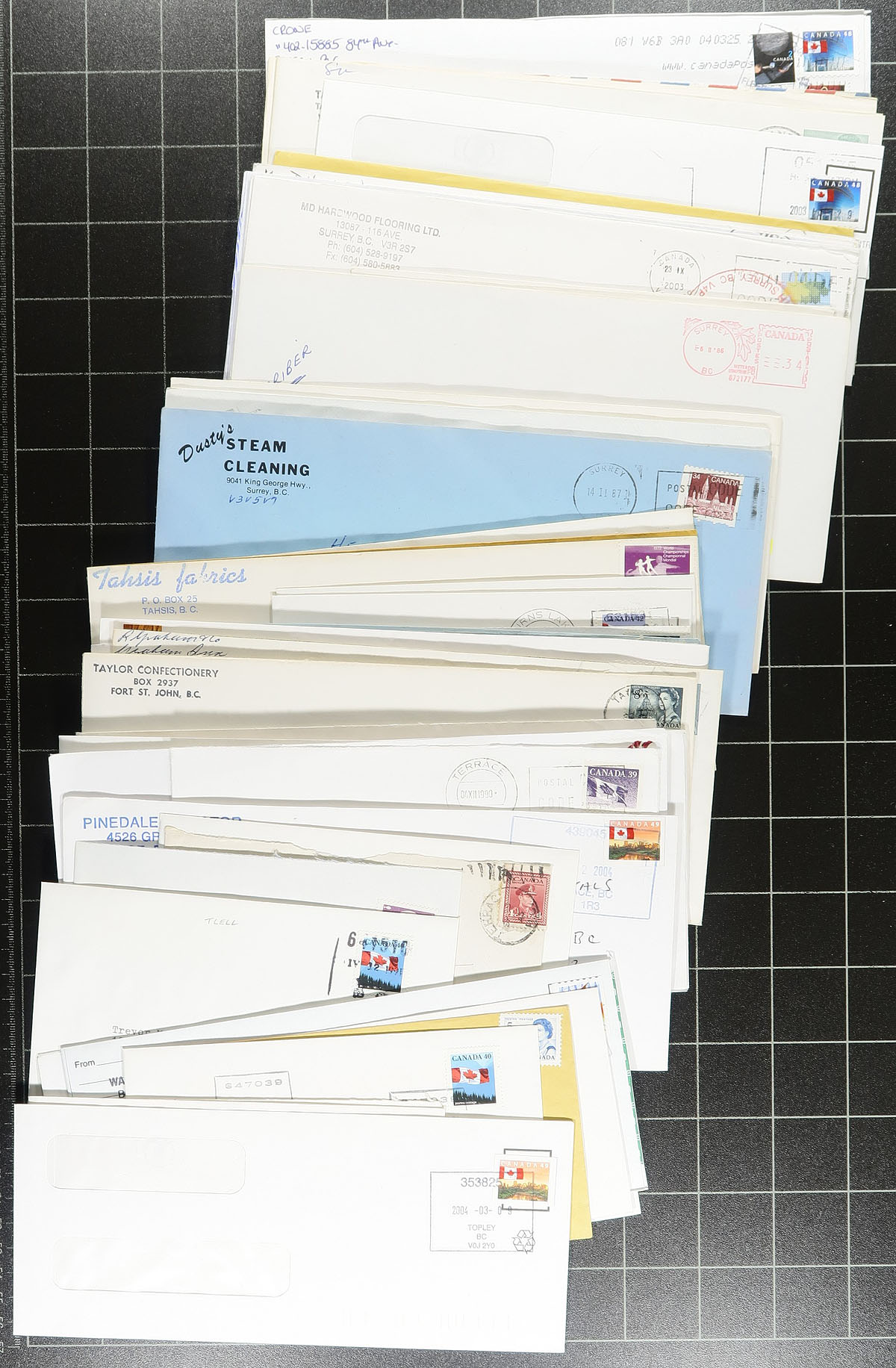 British Columbia Postal History. Accumulation of roughly 550 covers collected for British Columbia town postmarks,1920's-1990's. A cursory check indicated a few hundred different towns ranging from A to V, including Anahim Lake, Tomslake, Tod Inlet, Toad River, Tatlayoko Lake, Thetis Island, Ta-Ta Creek, and much more. Postmark interest includes cds, duplex, broken circle, slogan, machine, Klussendorf, along with Delta, Richmond, and Surrey 'Specialty' cancels, sub offices, and more. Some duplication with some larger towns, along with some corner advertising envelopes, various frankings, etc. A nice lot for the British Columbia town postmark collector, overall fine to very fine. Estimate =
