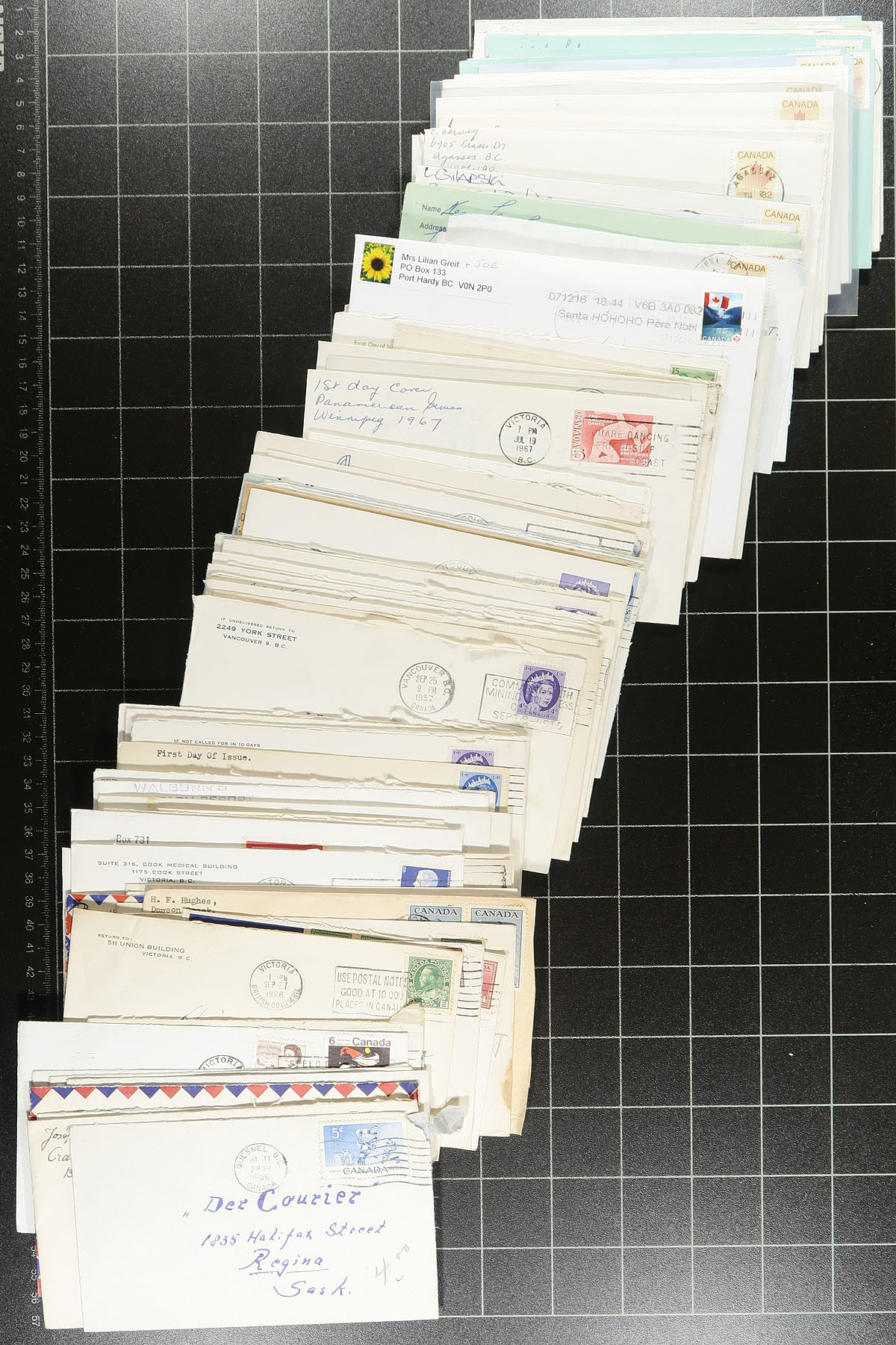 British Columbia Postal History. Accumulation of roughly 550 covers collected for British Columbia town postmarks,1920's-1990's. A cursory check indicated a few hundred different towns ranging from A to V, including Anahim Lake, Tomslake, Tod Inlet, Toad River, Tatlayoko Lake, Thetis Island, Ta-Ta Creek, and much more. Postmark interest includes cds, duplex, broken circle, slogan, machine, Klussendorf, along with Delta, Richmond, and Surrey 'Specialty' cancels, sub offices, and more. Some duplication with some larger towns, along with some corner advertising envelopes, various frankings, etc. A nice lot for the British Columbia town postmark collector, overall fine to very fine. Estimate =