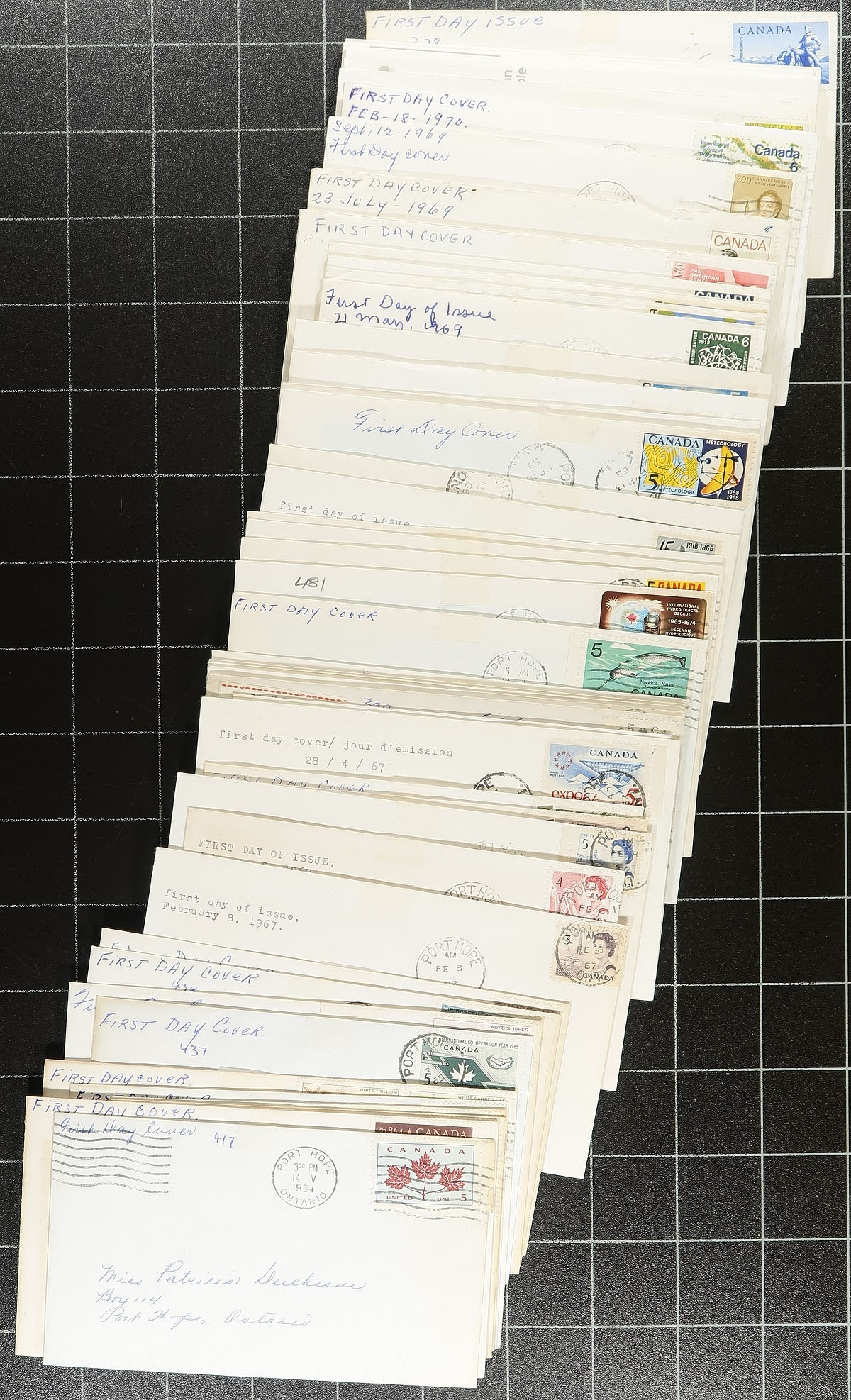 First Day Covers. An accumulation of many hundreds of first day covers in a bankers box, 1960's-2000, with singles, sets, blocks, souvenir sheet, and high denomination frankings. We note a small selection of uncacheted pre-1970 covers, along with still sealed presentation packs from Canada Post (Historic Vehicles, etc), and some oversized envelopes including a few from the popular "Art" series. A few small faults with the early covers, overall a fine to very fine lot. Estimate =