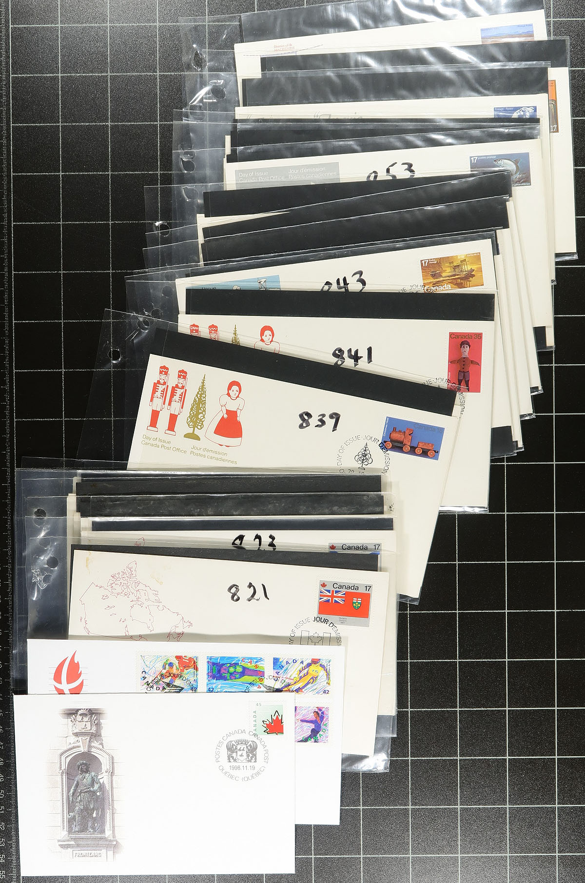 First Day Covers. An accumulation of many hundreds of first day covers in a bankers box, 1960's-2000, with singles, sets, blocks, souvenir sheet, and high denomination frankings. We note a small selection of uncacheted pre-1970 covers, along with still sealed presentation packs from Canada Post (Historic Vehicles, etc), and some oversized envelopes including a few from the popular "Art" series. A few small faults with the early covers, overall a fine to very fine lot. Estimate =