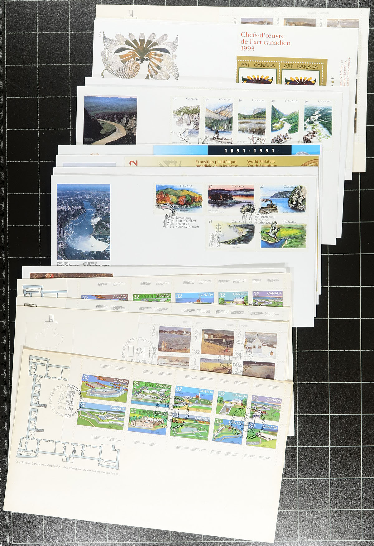 First Day Covers. An accumulation of many hundreds of first day covers in a bankers box, 1960's-2000, with singles, sets, blocks, souvenir sheet, and high denomination frankings. We note a small selection of uncacheted pre-1970 covers, along with still sealed presentation packs from Canada Post (Historic Vehicles, etc), and some oversized envelopes including a few from the popular "Art" series. A few small faults with the early covers, overall a fine to very fine lot. Estimate =