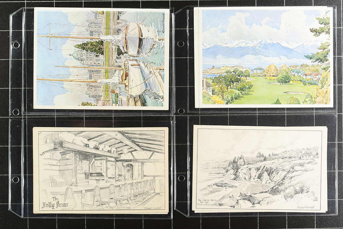Postcards. Edward Goodall Postcard Accumulation. Attractive group of 63 seemingly all different cards from Goodall’s early pencil sketch views to the Watercolor view cards that he produced later in his career. All neatly arranged in a Uni-Safe padded postcard album. Goodall’s scenes feature largely buildings, homes and ships from Victoria and area, but also some Vancouver and parts of Alberta. Goodall opened a studio located at his house in Oak Bay (Victoria) in 1945 and worked on his pencil sketch images which he then had printed to fill orders for postcards sales. In the late 1950’s he changed his medium, switching to watercolor images rather than pencil sketches. A nice showing of this ever-popular BC artist. Estimate =