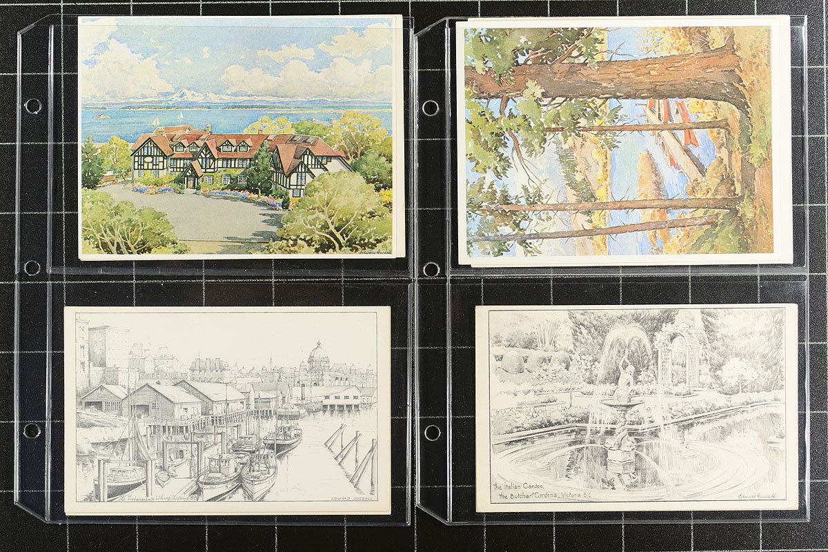 Postcards. Edward Goodall Postcard Accumulation. Attractive group of 63 seemingly all different cards from Goodall’s early pencil sketch views to the Watercolor view cards that he produced later in his career. All neatly arranged in a Uni-Safe padded postcard album. Goodall’s scenes feature largely buildings, homes and ships from Victoria and area, but also some Vancouver and parts of Alberta. Goodall opened a studio located at his house in Oak Bay (Victoria) in 1945 and worked on his pencil sketch images which he then had printed to fill orders for postcards sales. In the late 1950’s he changed his medium, switching to watercolor images rather than pencil sketches. A nice showing of this ever-popular BC artist. Estimate =