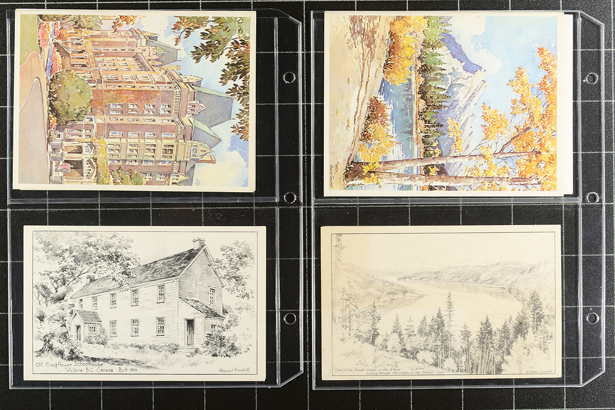 Postcards. Edward Goodall Postcard Accumulation. Attractive group of 63 seemingly all different cards from Goodall’s early pencil sketch views to the Watercolor view cards that he produced later in his career. All neatly arranged in a Uni-Safe padded postcard album. Goodall’s scenes feature largely buildings, homes and ships from Victoria and area, but also some Vancouver and parts of Alberta. Goodall opened a studio located at his house in Oak Bay (Victoria) in 1945 and worked on his pencil sketch images which he then had printed to fill orders for postcards sales. In the late 1950’s he changed his medium, switching to watercolor images rather than pencil sketches. A nice showing of this ever-popular BC artist. Estimate =