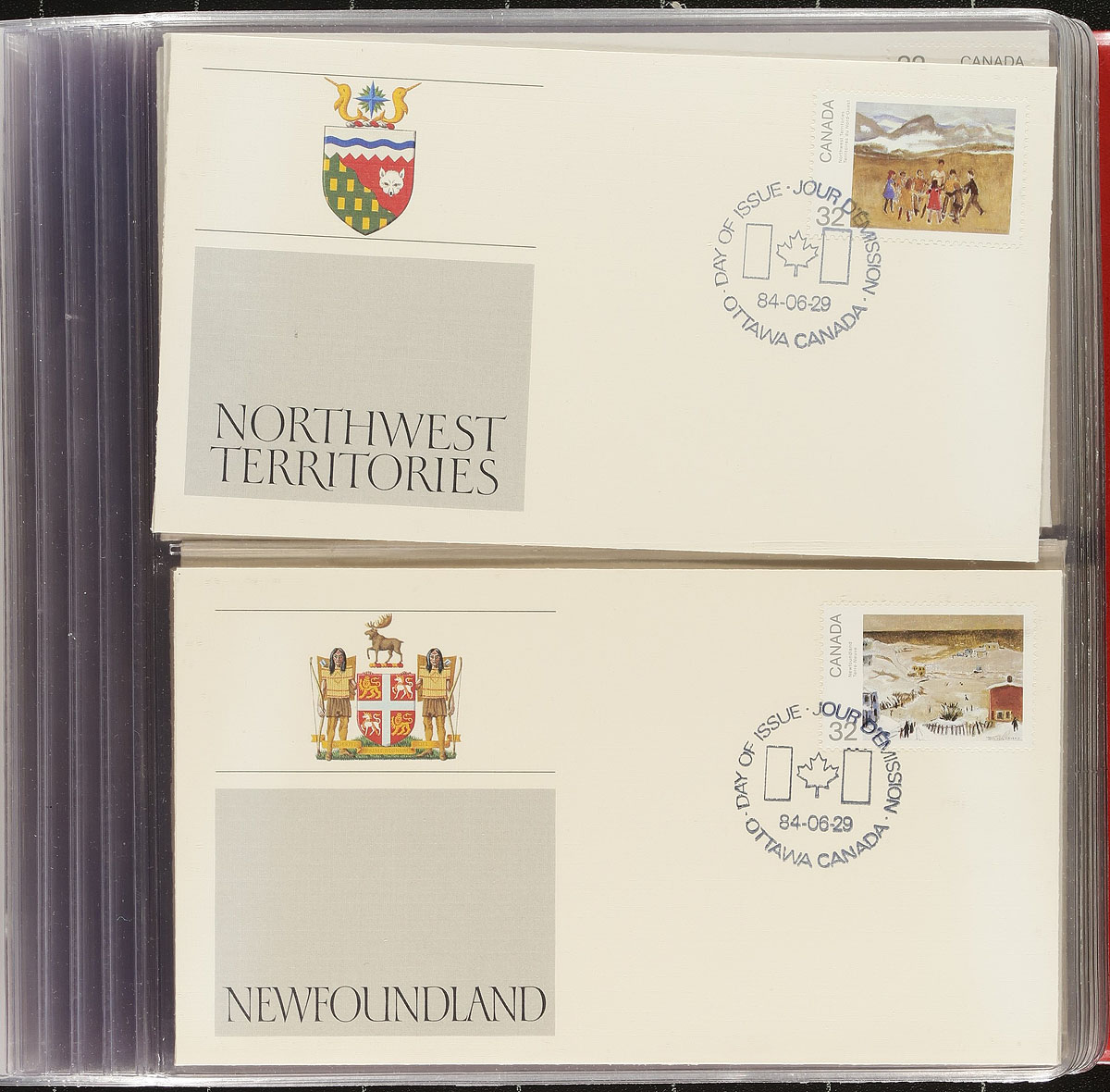 First Day Covers. A very clean selection of 152 First Day Covers produced by "Fleetwood" in 4x specially produced red Fleetwood FDC albums. Ranging from 1978-1985, this mostly all-different selection includes single, block and set franked covers, with empty spaces in the album to add missing / additional items as needed. Estimate =