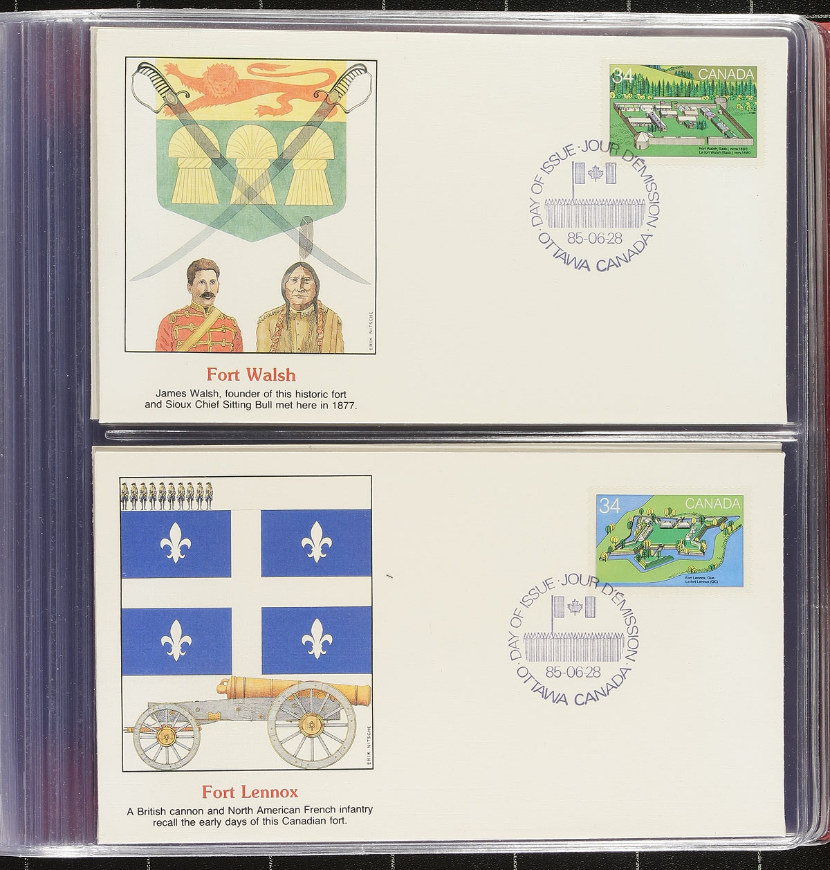 First Day Covers. A very clean selection of 152 First Day Covers produced by "Fleetwood" in 4x specially produced red Fleetwood FDC albums. Ranging from 1978-1985, this mostly all-different selection includes single, block and set franked covers, with empty spaces in the album to add missing / additional items as needed. Estimate =