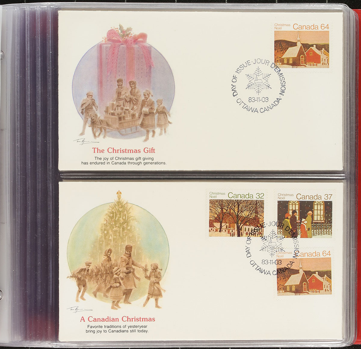 First Day Covers. A very clean selection of 152 First Day Covers produced by "Fleetwood" in 4x specially produced red Fleetwood FDC albums. Ranging from 1978-1985, this mostly all-different selection includes single, block and set franked covers, with empty spaces in the album to add missing / additional items as needed. Estimate =