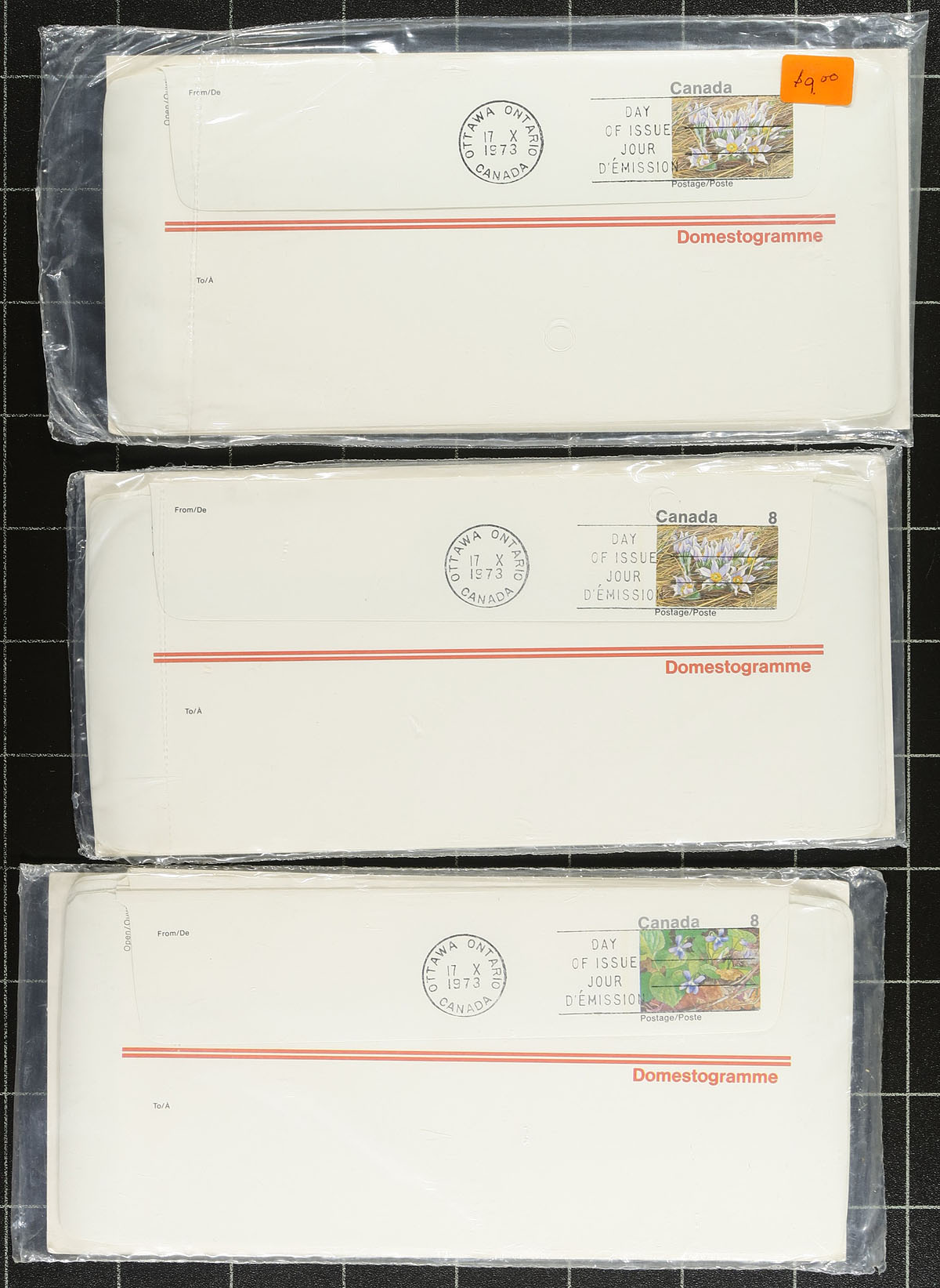 First Day Covers (plus more). A balance of consignment offering that starts off with 3 bulging Lighthouse FDC albums with a collection of Victoria BC cancel FDC (primarily 1970's with a mix of private cachets including elusive Brickley-Jones), followed by 100x FDC in a red "Canadian Covers" album with 1970's FDC including cachets from Kingswood, Fleetwood, Rosecraft and Canada Post. These FDC albums are then complimented with a range of "bundles" which include FDC cancel Postal Stationery "Aerogramme" /"Domestogrammes" (still in P.O. packaging x13), a Post Office pack of "Canada 92" postal stationery, 1976 Montreal Olympics special event cancels, 2x "Stik-n-Tik" Post Office packs, Post Office "Four Seasons" pack, 1981 Canada Post "Proclamation Day" cover to P.O. employees (x4), a "pack" of dozens of stamps used on bank cheques and a bundle of a few dozen 1950's Vancouver BC commercial covers (#10) with business corner cards. Well worth the estimated value. Estimate =