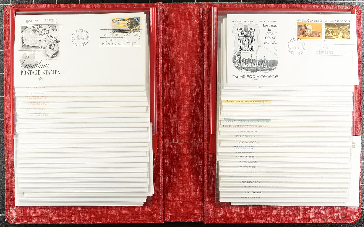 First Day Covers (plus more). A balance of consignment offering that starts off with 3 bulging Lighthouse FDC albums with a collection of Victoria BC cancel FDC (primarily 1970's with a mix of private cachets including elusive Brickley-Jones), followed by 100x FDC in a red "Canadian Covers" album with 1970's FDC including cachets from Kingswood, Fleetwood, Rosecraft and Canada Post. These FDC albums are then complimented with a range of "bundles" which include FDC cancel Postal Stationery "Aerogramme" /"Domestogrammes" (still in P.O. packaging x13), a Post Office pack of "Canada 92" postal stationery, 1976 Montreal Olympics special event cancels, 2x "Stik-n-Tik" Post Office packs, Post Office "Four Seasons" pack, 1981 Canada Post "Proclamation Day" cover to P.O. employees (x4), a "pack" of dozens of stamps used on bank cheques and a bundle of a few dozen 1950's Vancouver BC commercial covers (#10) with business corner cards. Well worth the estimated value. Estimate =