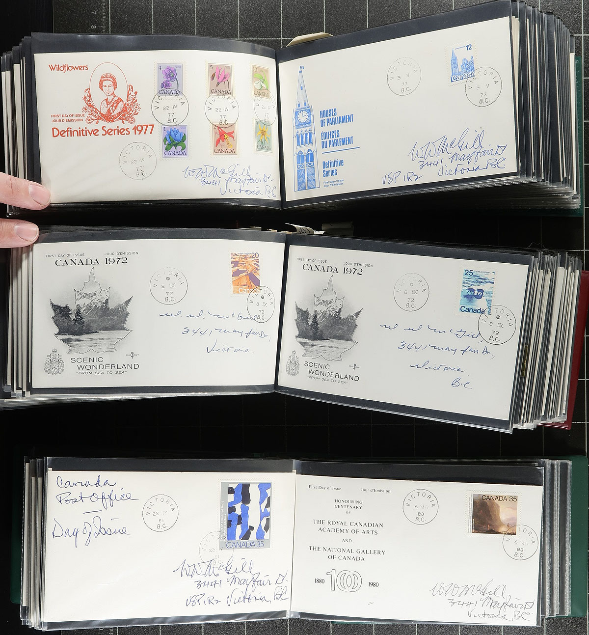 First Day Covers (plus more). A balance of consignment offering that starts off with 3 bulging Lighthouse FDC albums with a collection of Victoria BC cancel FDC (primarily 1970's with a mix of private cachets including elusive Brickley-Jones), followed by 100x FDC in a red "Canadian Covers" album with 1970's FDC including cachets from Kingswood, Fleetwood, Rosecraft and Canada Post. These FDC albums are then complimented with a range of "bundles" which include FDC cancel Postal Stationery "Aerogramme" /"Domestogrammes" (still in P.O. packaging x13), a Post Office pack of "Canada 92" postal stationery, 1976 Montreal Olympics special event cancels, 2x "Stik-n-Tik" Post Office packs, Post Office "Four Seasons" pack, 1981 Canada Post "Proclamation Day" cover to P.O. employees (x4), a "pack" of dozens of stamps used on bank cheques and a bundle of a few dozen 1950's Vancouver BC commercial covers (#10) with business corner cards. Well worth the estimated value. Estimate =