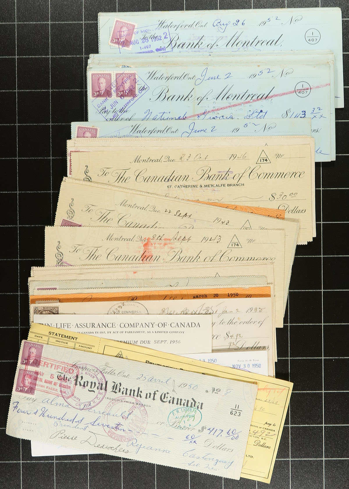 First Day Covers (plus more). A balance of consignment offering that starts off with 3 bulging Lighthouse FDC albums with a collection of Victoria BC cancel FDC (primarily 1970's with a mix of private cachets including elusive Brickley-Jones), followed by 100x FDC in a red "Canadian Covers" album with 1970's FDC including cachets from Kingswood, Fleetwood, Rosecraft and Canada Post. These FDC albums are then complimented with a range of "bundles" which include FDC cancel Postal Stationery "Aerogramme" /"Domestogrammes" (still in P.O. packaging x13), a Post Office pack of "Canada 92" postal stationery, 1976 Montreal Olympics special event cancels, 2x "Stik-n-Tik" Post Office packs, Post Office "Four Seasons" pack, 1981 Canada Post "Proclamation Day" cover to P.O. employees (x4), a "pack" of dozens of stamps used on bank cheques and a bundle of a few dozen 1950's Vancouver BC commercial covers (#10) with business corner cards. Well worth the estimated value. Estimate =