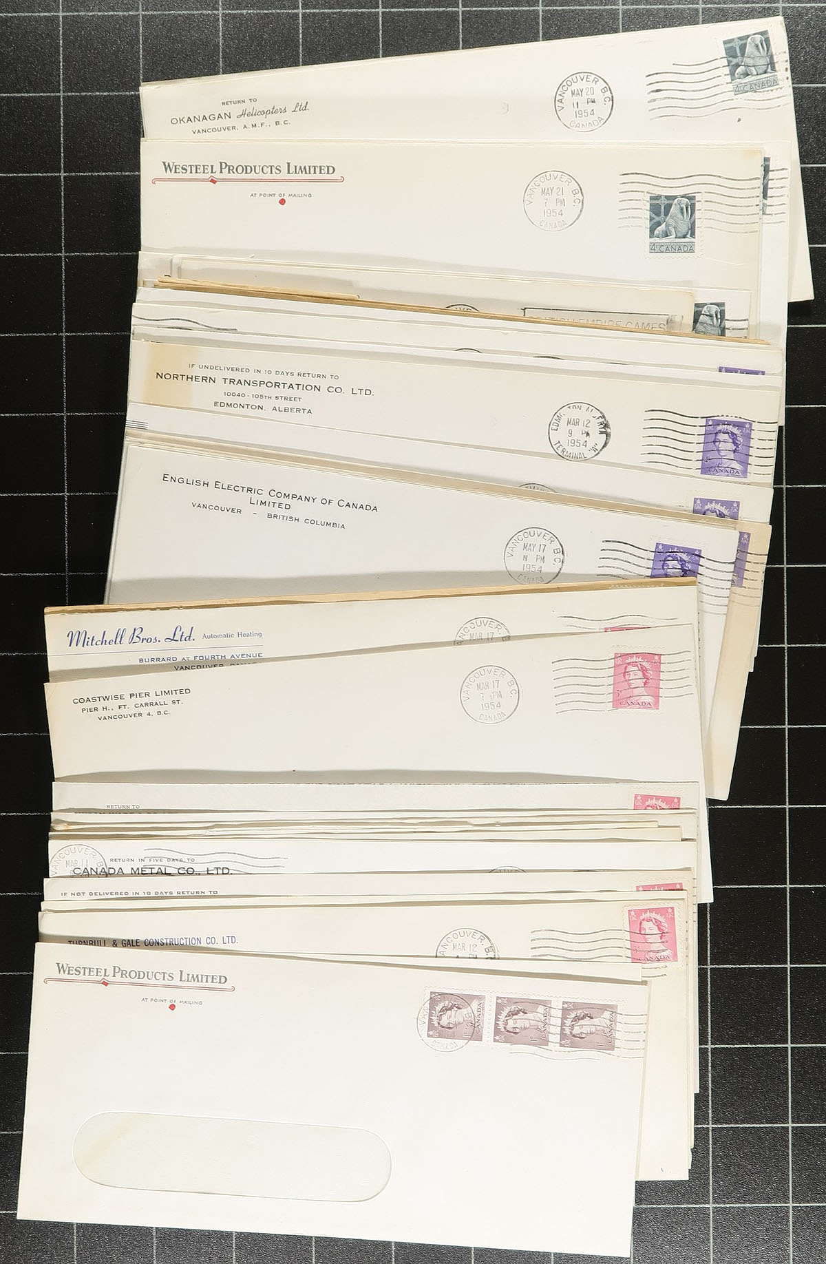 First Day Covers (plus more). A balance of consignment offering that starts off with 3 bulging Lighthouse FDC albums with a collection of Victoria BC cancel FDC (primarily 1970's with a mix of private cachets including elusive Brickley-Jones), followed by 100x FDC in a red "Canadian Covers" album with 1970's FDC including cachets from Kingswood, Fleetwood, Rosecraft and Canada Post. These FDC albums are then complimented with a range of "bundles" which include FDC cancel Postal Stationery "Aerogramme" /"Domestogrammes" (still in P.O. packaging x13), a Post Office pack of "Canada 92" postal stationery, 1976 Montreal Olympics special event cancels, 2x "Stik-n-Tik" Post Office packs, Post Office "Four Seasons" pack, 1981 Canada Post "Proclamation Day" cover to P.O. employees (x4), a "pack" of dozens of stamps used on bank cheques and a bundle of a few dozen 1950's Vancouver BC commercial covers (#10) with business corner cards. Well worth the estimated value. Estimate =