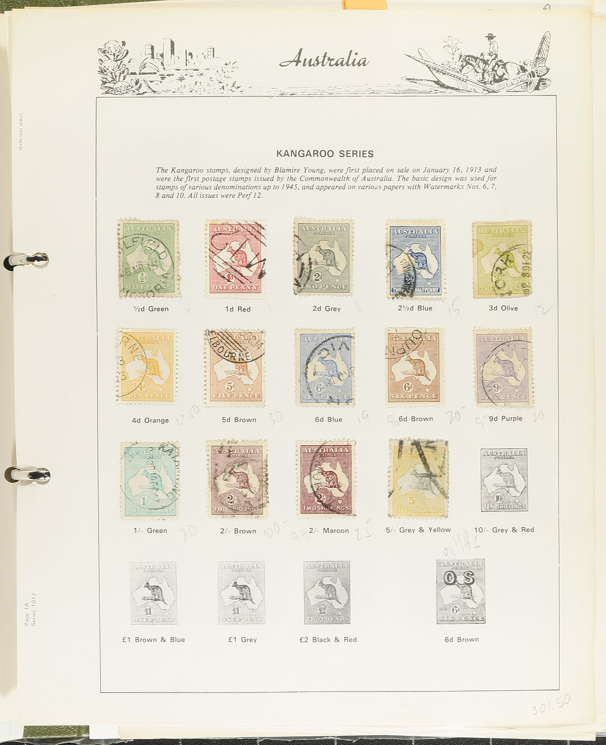 Nice collection of classic used Australia, 1913-1937, containing a few hundred stamps neatly arranged on homemade pages. The collection ranges from Scott #1/165, including a few sets and back of the book stamps, and two stock pages of Australia States issues, noting a decent selection of Kangaroos with #s 1-5, 9, 38-42, 45-46, 48-50, 52, along with King George V Heads, and sets cataloguing $10 to $30 and up each. Owner's 2023 Scott catalogue value for the collection totals US$902.00 (not including the Australia States pages). A nice collection that should be continued, overall fine to very fine. All pages shown online. Estimate =