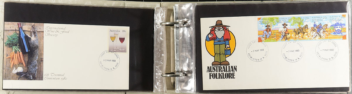 Group of roughly 425 Australia first day covers, 1960's-1990's, with a few covers possible on either side of the given range, in 3 albums with loose material. A cursory check indicated singles, primarily sets, souvenir sheet, and high denomination frankings, along with first day maximum cards and a few pieces of postal stationery. A nice colourful lot for all collectors, overall fine to very fine. Estimate =