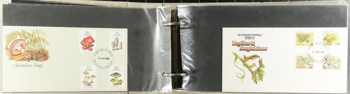 Group of roughly 425 Australia first day covers, 1960's-1990's, with a few covers possible on either side of the given range, in 3 albums with loose material. A cursory check indicated singles, primarily sets, souvenir sheet, and high denomination frankings, along with first day maximum cards and a few pieces of postal stationery. A nice colourful lot for all collectors, overall fine to very fine. Estimate =
