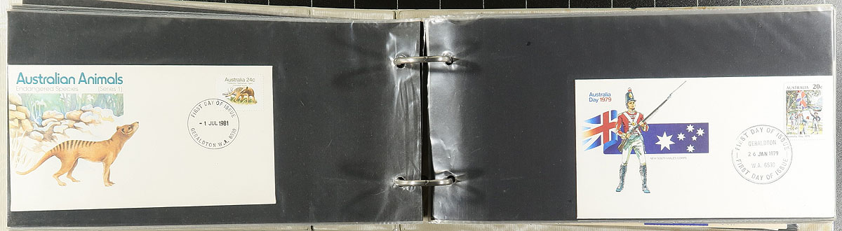 Group of roughly 425 Australia first day covers, 1960's-1990's, with a few covers possible on either side of the given range, in 3 albums with loose material. A cursory check indicated singles, primarily sets, souvenir sheet, and high denomination frankings, along with first day maximum cards and a few pieces of postal stationery. A nice colourful lot for all collectors, overall fine to very fine. Estimate =