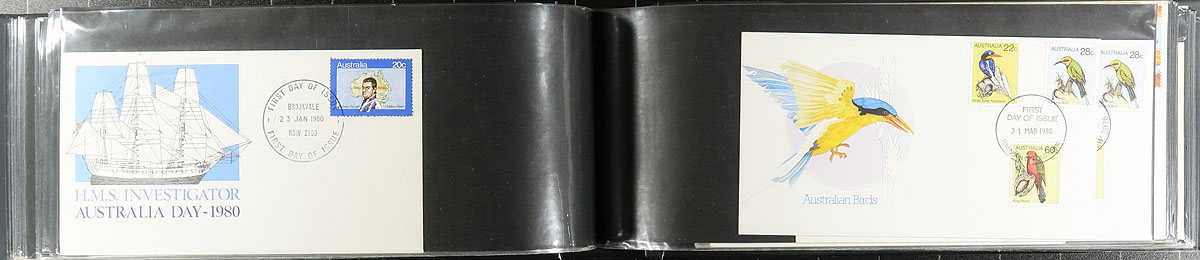 Group of roughly 425 Australia first day covers, 1960's-1990's, with a few covers possible on either side of the given range, in 3 albums with loose material. A cursory check indicated singles, primarily sets, souvenir sheet, and high denomination frankings, along with first day maximum cards and a few pieces of postal stationery. A nice colourful lot for all collectors, overall fine to very fine. Estimate =