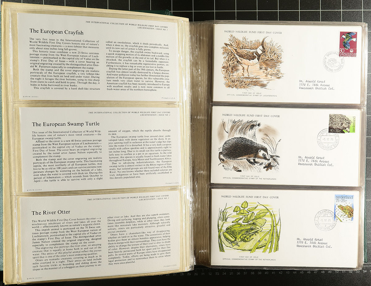 Cover Collections. Group of 5 collections containing roughly 325 covers filling a carton including: The International Collection of World Wildlife First Day Covers, First Day Covers From Around the World, and 3 volumes of Cover of the Month International Collections. All the material appears to range from the late 1970's to the early 1980's, and ideal for the cover and topical / thematic collector, overall fine to very nice. Estimate =