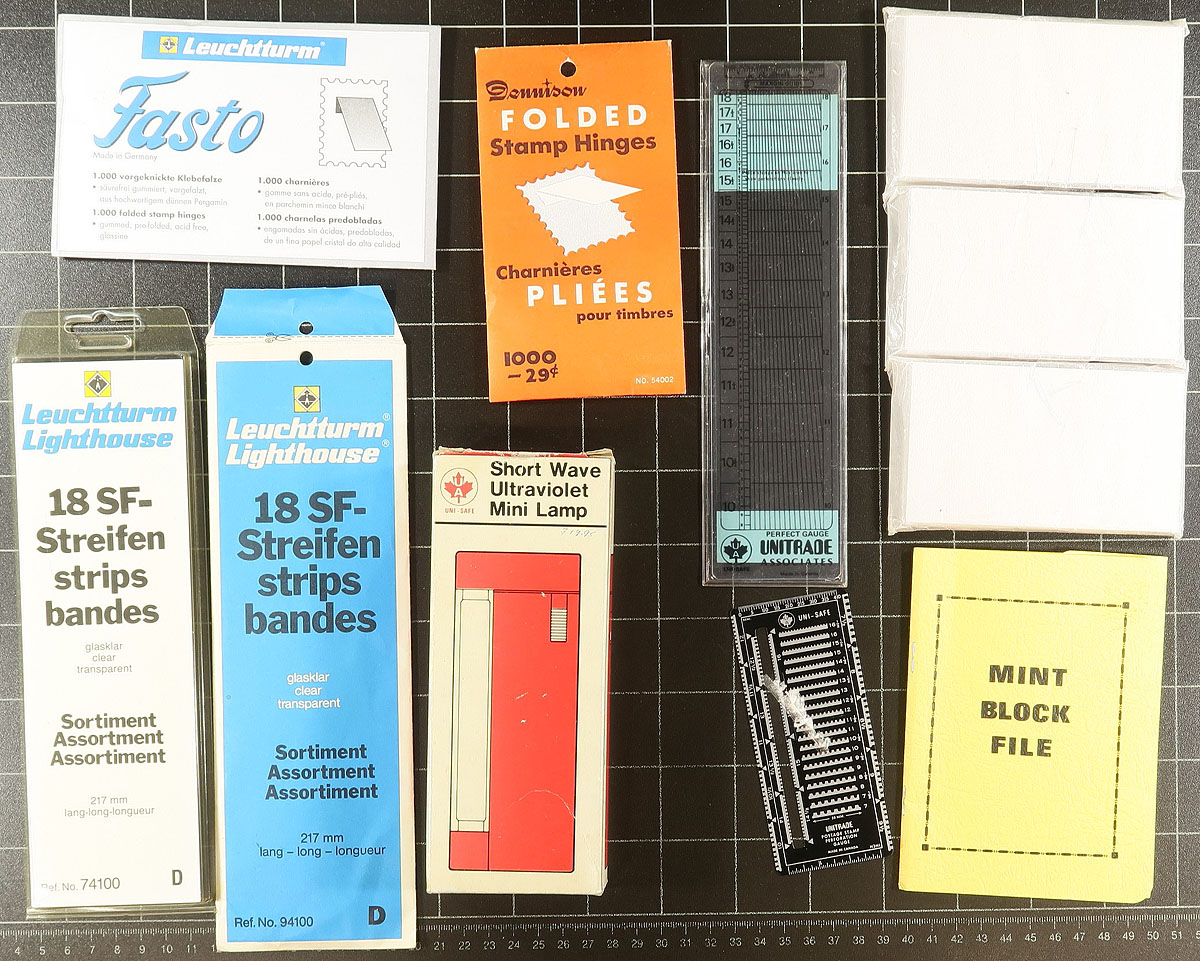 Carton full of useful supplies including: 3 Uni-Safe three ring binders with slipcases, 5 stockbooks of various sizes and figerations, loose stockpages, 4 mint sheet files, and more. Condition ranges from used to almost new, with original retail prices in the several hundreds of dollars. Useful and waiting for a new owner. Estimate =
