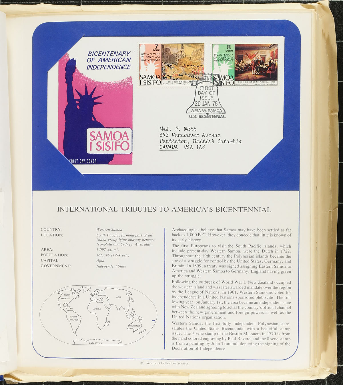 Topical Collections, containing a few hundred stamps and or covers including: The Christmas Collectors Panels (featuring art from Norman Rockwell), International First Day Covers Honouring America's BiCentennial, US First Day Covers and Special Covers in 2 volumes, Annual Collections from 1989-1990, 1992-1993, 1995, and more. A nice lot with roughly $100 of face value stamps and a few hundred dollars of catalogue value, overall fine to very fine. Estimate =