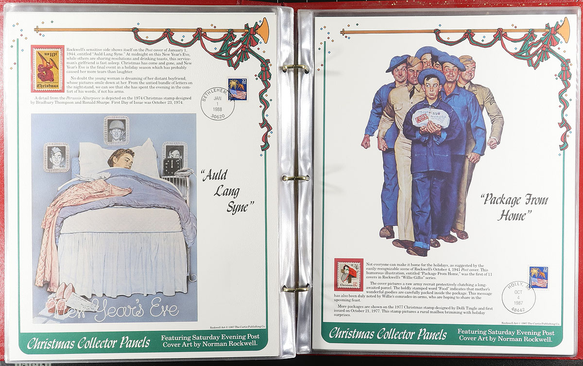 Topical Collections, containing a few hundred stamps and or covers including: The Christmas Collectors Panels (featuring art from Norman Rockwell), International First Day Covers Honouring America's BiCentennial, US First Day Covers and Special Covers in 2 volumes, Annual Collections from 1989-1990, 1992-1993, 1995, and more. A nice lot with roughly $100 of face value stamps and a few hundred dollars of catalogue value, overall fine to very fine. Estimate =