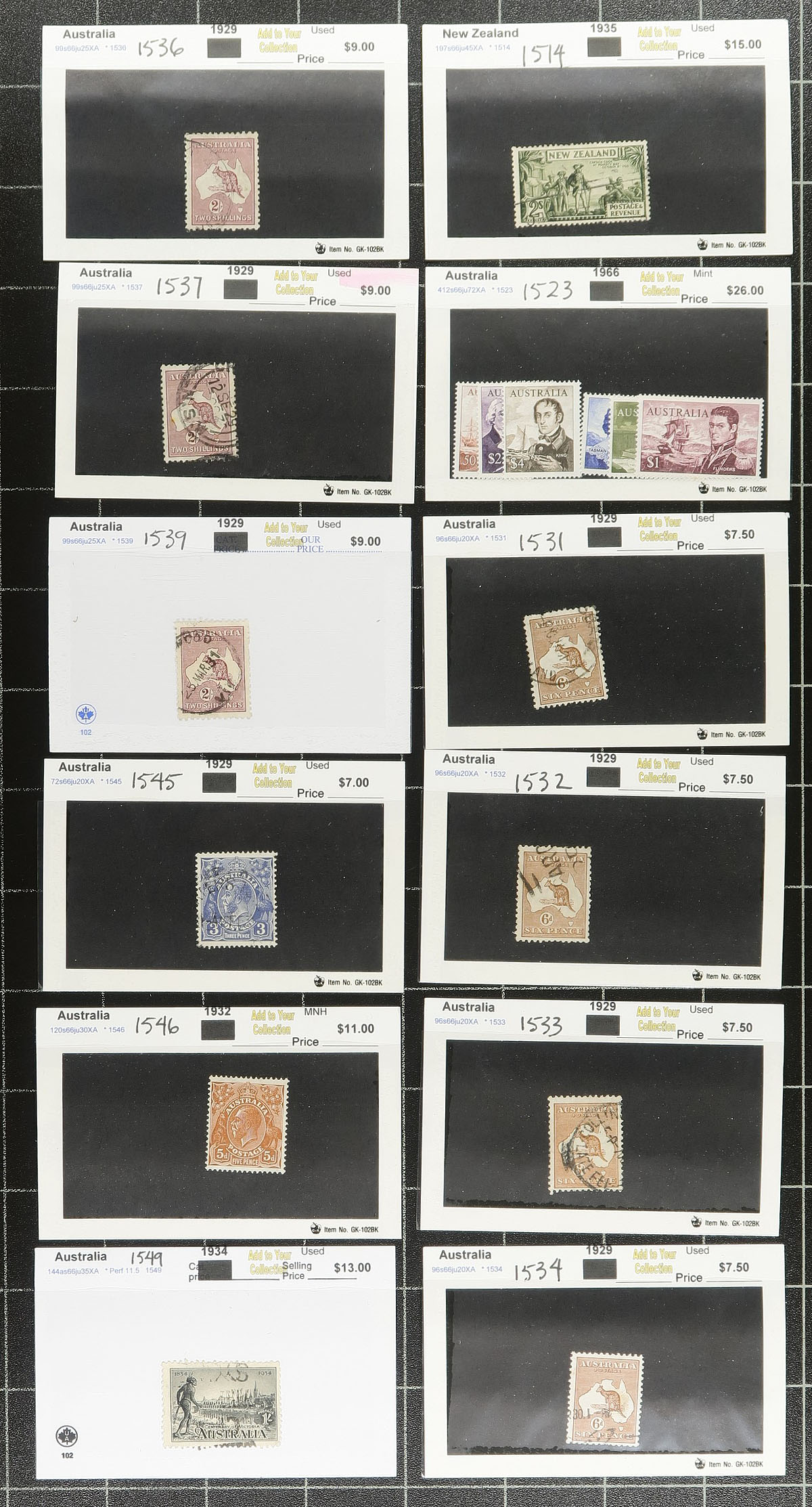 A bundle of 72x "102" cards, all with British Commonwealth singles, sets or assemblies. Each priced between $1-$10 each (with a few higher, up to $26.00), which is the retail pricing (rather than the catalogue value). Noted strength in Australia, New Zealand and Malta, with both mint and used throughout. Estimate =