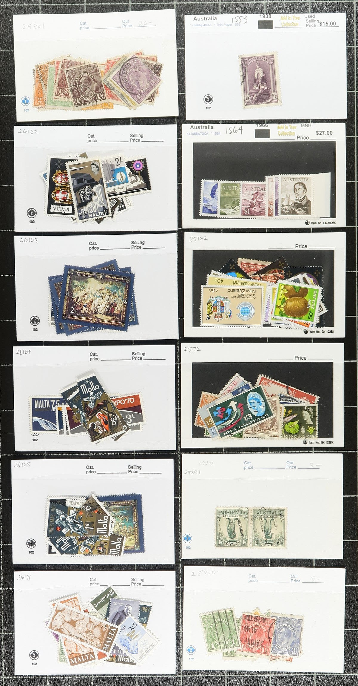 A bundle of 72x "102" cards, all with British Commonwealth singles, sets or assemblies. Each priced between $1-$10 each (with a few higher, up to $26.00), which is the retail pricing (rather than the catalogue value). Noted strength in Australia, New Zealand and Malta, with both mint and used throughout. Estimate =