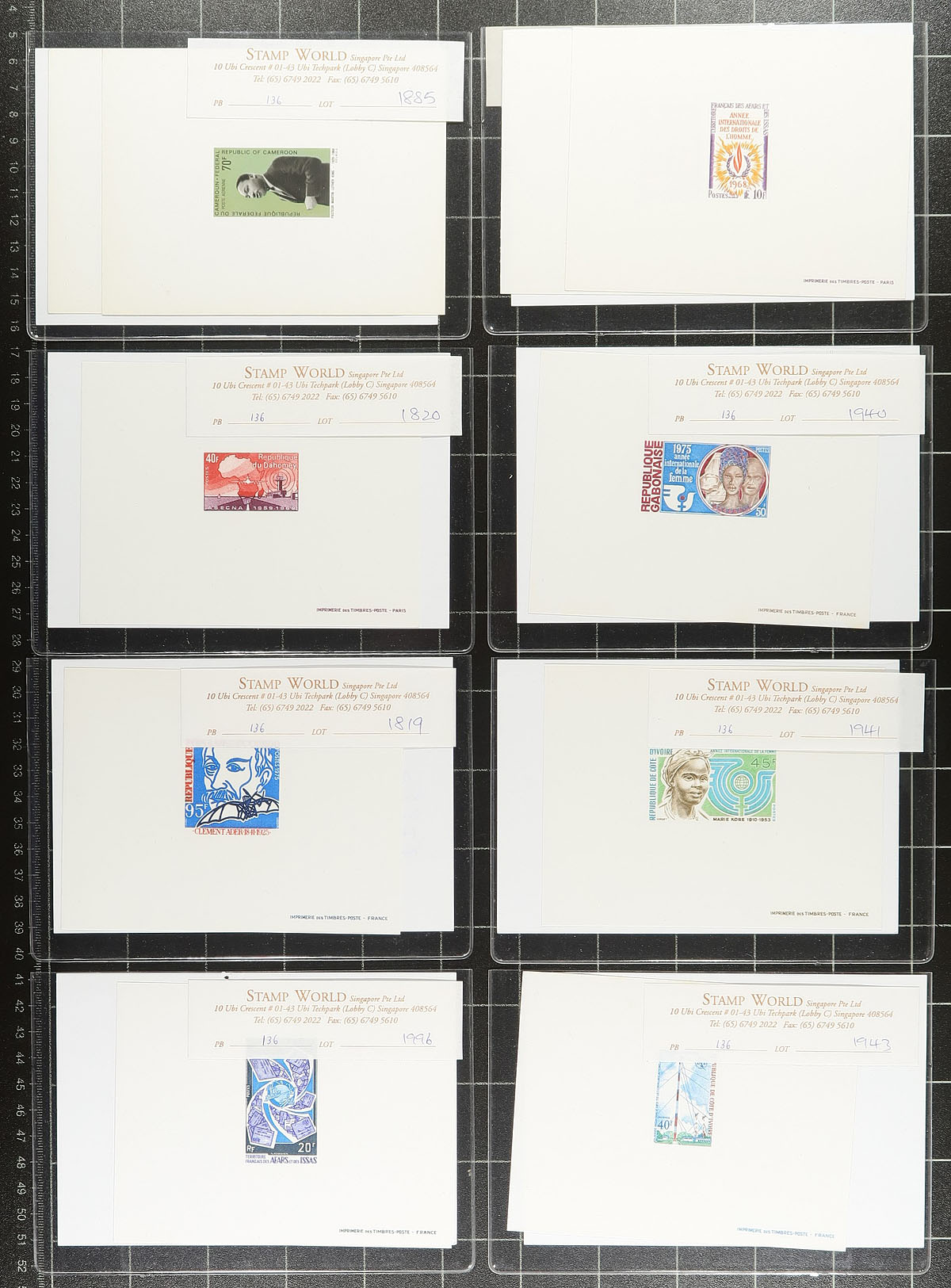 Deluxe Proofs. VF quality selection of 35 different large format "EPREUVES DELUXES" for a host of French colonies. The countries consist of Dahomey, Mali, Upper Volta, Mauritania, Niger, Ivory Coast, Gabon, Afars & Issas, Congo, Cameroun and Chad. Includes multicolour engravings, exceptional topicals (flora, fauna, famous persons, UNESCO, ITU, International Womens' Year and many other subjects). I've seen these offered on Ebay for anywhere from $10.00 to $150.00 each. Estimate =