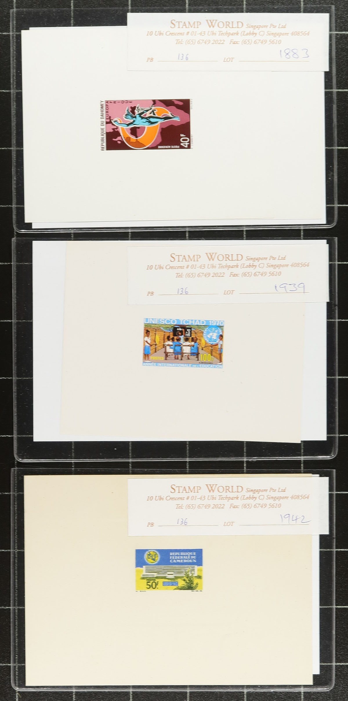 Deluxe Proofs. VF quality selection of 35 different large format "EPREUVES DELUXES" for a host of French colonies. The countries consist of Dahomey, Mali, Upper Volta, Mauritania, Niger, Ivory Coast, Gabon, Afars & Issas, Congo, Cameroun and Chad. Includes multicolour engravings, exceptional topicals (flora, fauna, famous persons, UNESCO, ITU, International Womens' Year and many other subjects). I've seen these offered on Ebay for anywhere from $10.00 to $150.00 each. Estimate =