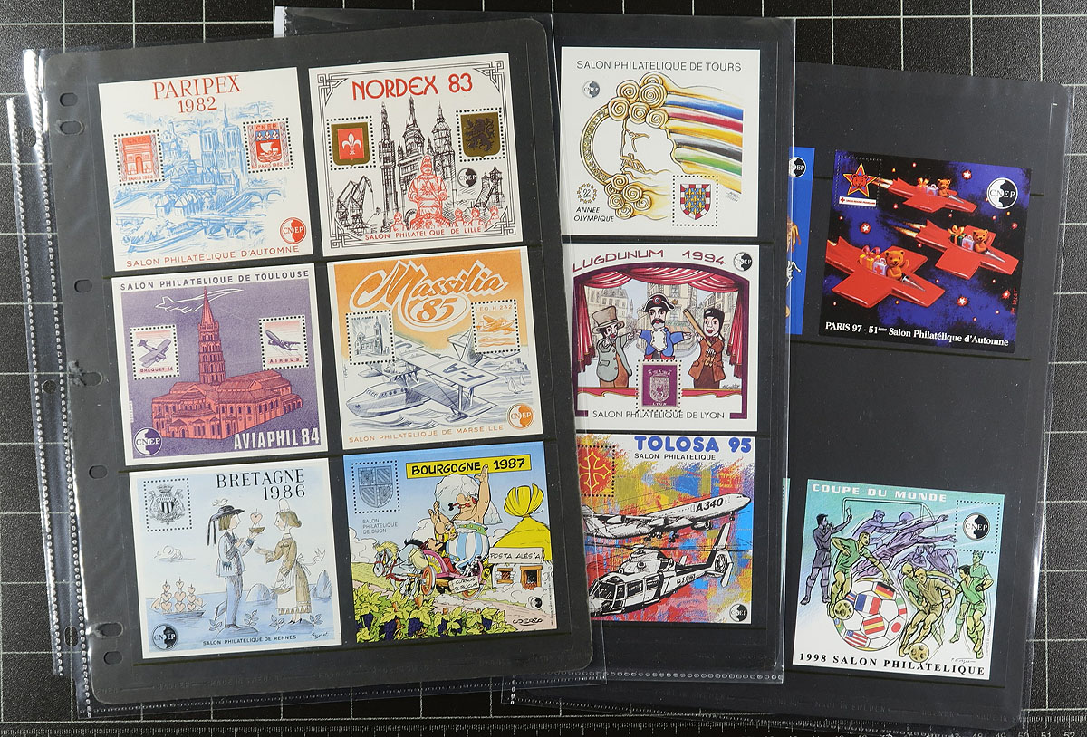 C.N. E. P. Souvenir Sheet Lot. Lightly duplicated VF NH quality selection of 30 mostly different 1980 to 1999 issue Yvert & Tellier listed C.N. E. P. souvenir sheets. These limited issue sheets were produced in conjunction with philatelic expositions and are often overlooked by collectors. 2021 Yvert & Yellier €877.00 in Canadian Dollars =