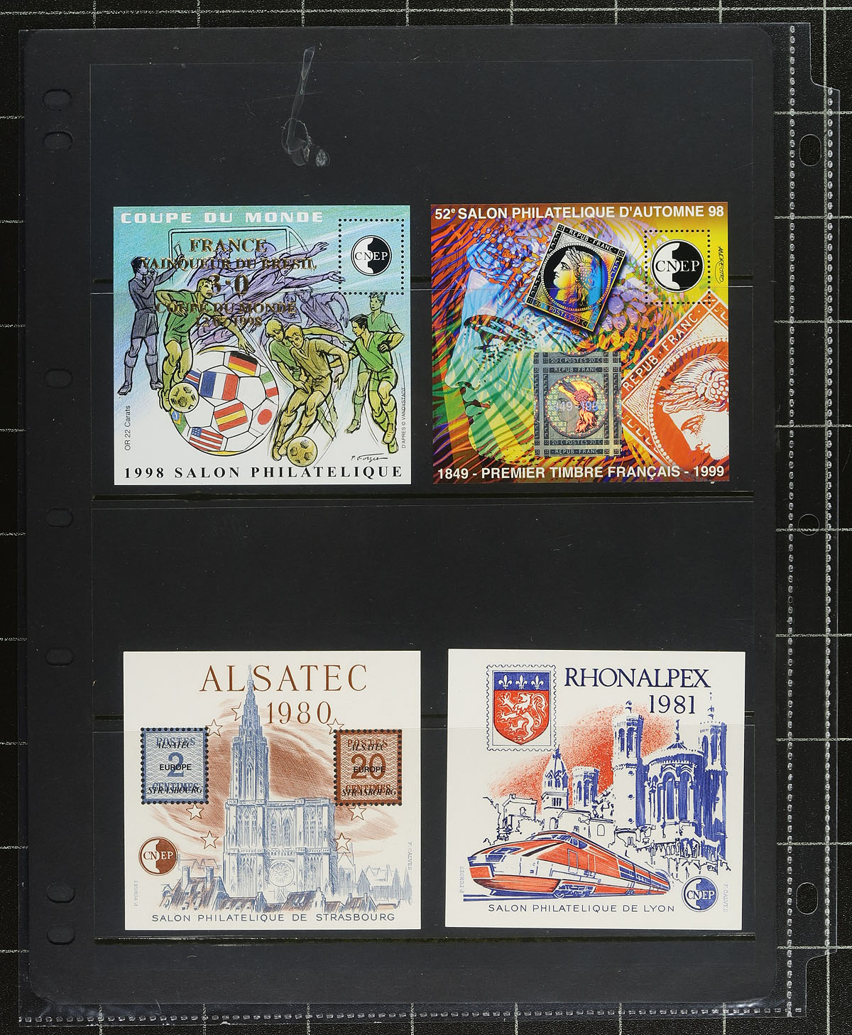 C.N. E. P. Souvenir Sheet Lot. Lightly duplicated VF NH quality selection of 30 mostly different 1980 to 1999 issue Yvert & Tellier listed C.N. E. P. souvenir sheets. These limited issue sheets were produced in conjunction with philatelic expositions and are often overlooked by collectors. 2021 Yvert & Yellier €877.00 in Canadian Dollars =