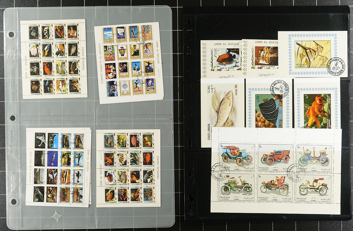 An assortment of Africa and Middle East, many of which were former bidboard lots, all untouched since purchase. In order of appearance, there is a used pair of Iraq #O229a with narrow overprint (cat $95.00), a mounted collection of use Bahrain from 1933-2002 (cat $222.00) and some cat topicals from an assortment of countries. The are followed by Lebanon which has a couple of pages of mint never hinged 1966-72 (cat $122.00), a mix of mint and used from several countries (e.g. Iran, Kuwait, Palestine, UAE) cat $419.00 and some Jordan mini-sheets (cat $297.00). Africa is a bit more lightly represented, with wholesale quantities of two Zaire souvenir sheets (cat $82.50), "recent" Somalia thematics from 2002 (not listed in Scott, but Yvert is apparently €120.00). Finishing with a batch of Bileski-promoted Liberian trial colour proofs of the 1959 African Freedom Day set. Not the type of material that we regularly see. Estimate =