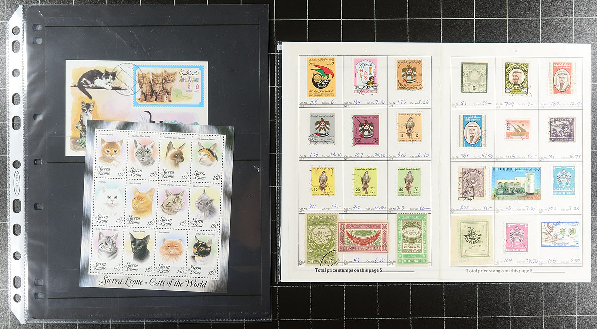 An assortment of Africa and Middle East, many of which were former bidboard lots, all untouched since purchase. In order of appearance, there is a used pair of Iraq #O229a with narrow overprint (cat $95.00), a mounted collection of use Bahrain from 1933-2002 (cat $222.00) and some cat topicals from an assortment of countries. The are followed by Lebanon which has a couple of pages of mint never hinged 1966-72 (cat $122.00), a mix of mint and used from several countries (e.g. Iran, Kuwait, Palestine, UAE) cat $419.00 and some Jordan mini-sheets (cat $297.00). Africa is a bit more lightly represented, with wholesale quantities of two Zaire souvenir sheets (cat $82.50), "recent" Somalia thematics from 2002 (not listed in Scott, but Yvert is apparently €120.00). Finishing with a batch of Bileski-promoted Liberian trial colour proofs of the 1959 African Freedom Day set. Not the type of material that we regularly see. Estimate =