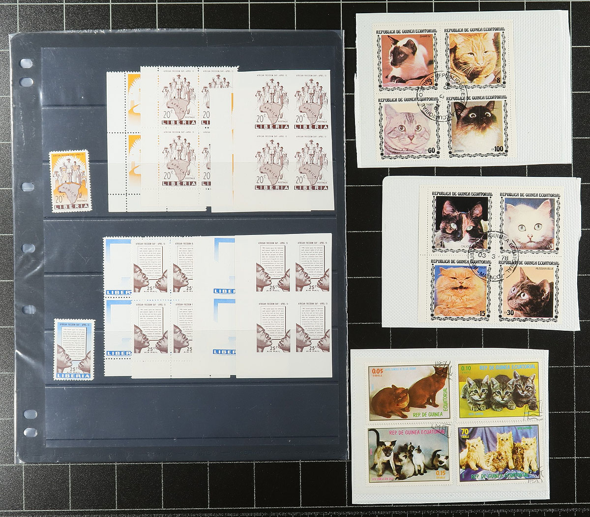 An assortment of Africa and Middle East, many of which were former bidboard lots, all untouched since purchase. In order of appearance, there is a used pair of Iraq #O229a with narrow overprint (cat $95.00), a mounted collection of use Bahrain from 1933-2002 (cat $222.00) and some cat topicals from an assortment of countries. The are followed by Lebanon which has a couple of pages of mint never hinged 1966-72 (cat $122.00), a mix of mint and used from several countries (e.g. Iran, Kuwait, Palestine, UAE) cat $419.00 and some Jordan mini-sheets (cat $297.00). Africa is a bit more lightly represented, with wholesale quantities of two Zaire souvenir sheets (cat $82.50), "recent" Somalia thematics from 2002 (not listed in Scott, but Yvert is apparently €120.00). Finishing with a batch of Bileski-promoted Liberian trial colour proofs of the 1959 African Freedom Day set. Not the type of material that we regularly see. Estimate =