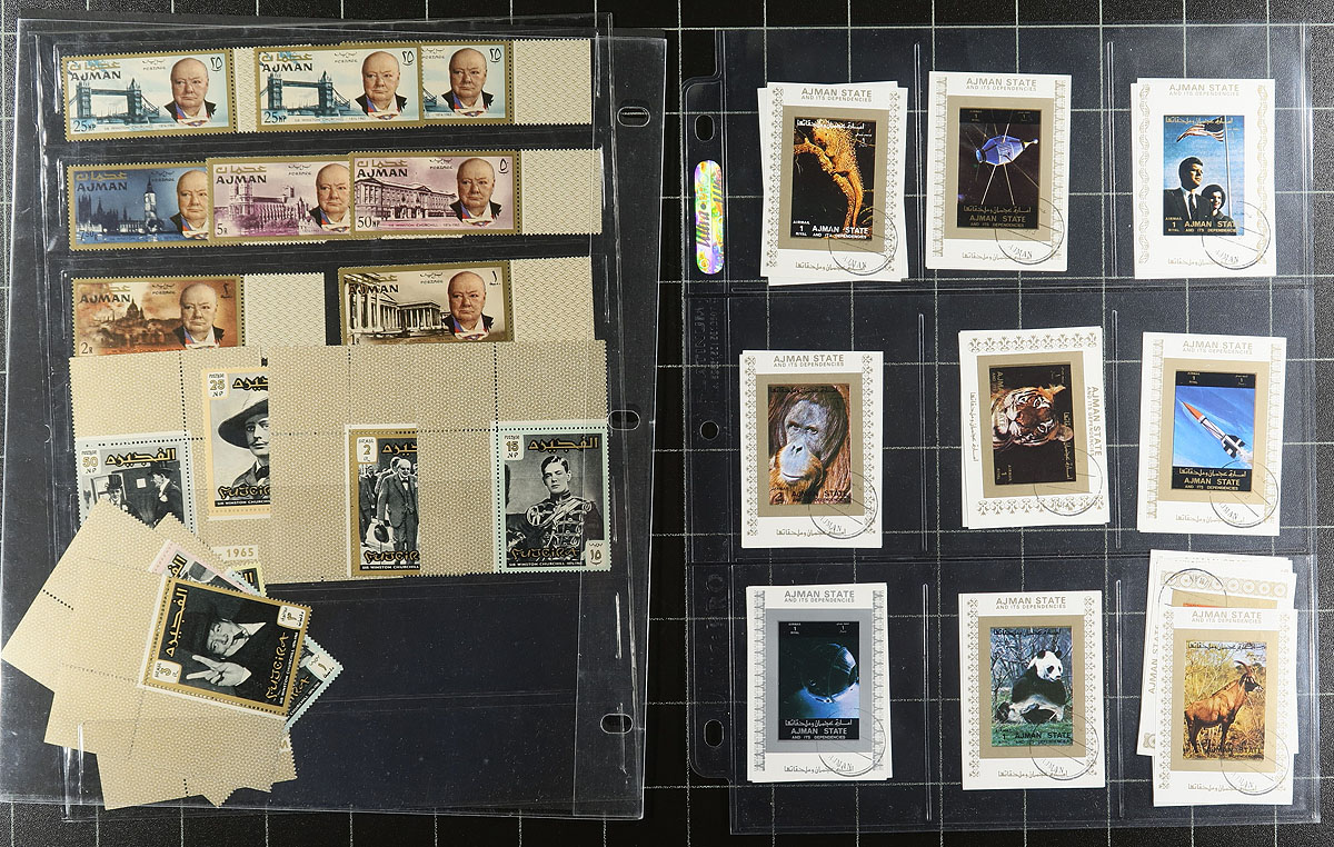 An assortment of Africa and Middle East, many of which were former bidboard lots, all untouched since purchase. In order of appearance, there is a used pair of Iraq #O229a with narrow overprint (cat $95.00), a mounted collection of use Bahrain from 1933-2002 (cat $222.00) and some cat topicals from an assortment of countries. The are followed by Lebanon which has a couple of pages of mint never hinged 1966-72 (cat $122.00), a mix of mint and used from several countries (e.g. Iran, Kuwait, Palestine, UAE) cat $419.00 and some Jordan mini-sheets (cat $297.00). Africa is a bit more lightly represented, with wholesale quantities of two Zaire souvenir sheets (cat $82.50), "recent" Somalia thematics from 2002 (not listed in Scott, but Yvert is apparently €120.00). Finishing with a batch of Bileski-promoted Liberian trial colour proofs of the 1959 African Freedom Day set. Not the type of material that we regularly see. Estimate =