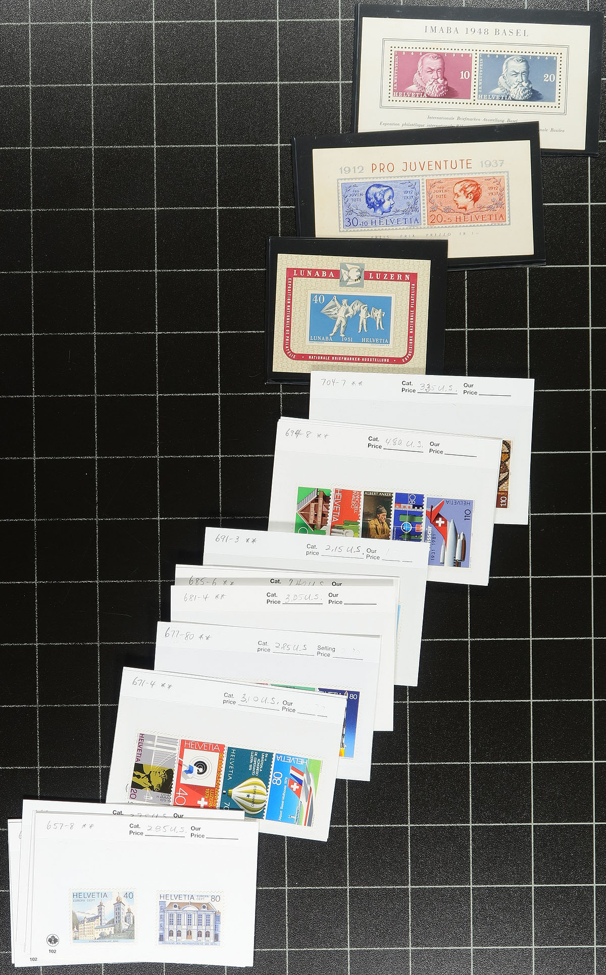 Mint collection starter group, with an assortment of former bidboard lots, dealer cards, and some other miscellany (semi-postal souvenir sheet #B178, a couple of pages of modern booklets). Mostly 20th century issues, with a mix of definitives, commemoratives and "back of the book". Fresh appearance, with a mix of hinged and never hinged. Total catalogue value will be several hundred dollars. Estimate =