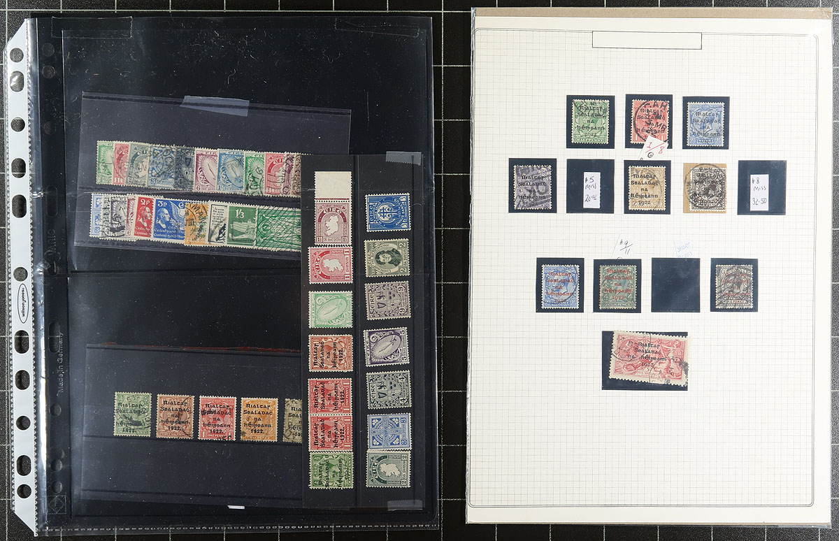 A chaotic group of mint and used on stock and album pages, with a good mix of early overprints on British stamps with an assortment of issues through to the end of the century. Condition appears to be quite good and there is some duplication. Various owner’s total catalogue value is about US$1000.00. A bonus to this is a 13-ring Lighthouse binder and matching slipcase, in Emerald green, with regular pages from 2000-2003 (a few stamps in owner applied black mounts, but binder alone retails at $145.00). Estimate =