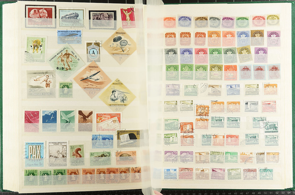 Bankers box with an assortment of albums and stockbooks holding lots of stamps with value and potential. The albums include two "Davo" volumes with pages from 1970-1974 and 1980-1988 (with 400 different stamps between them, and the binders retail at over $100.00 each). On top of that there are a couple of binders with mint collections (one has some nice mint souvenir sheets (e.g. #855b, #C80, #C157, #C166, #1202a), and a couple of stockbooks (16 and 48-page) with a mix of mint and used (pre-1980). A couple of loose items include an interesting overprinted #2N48, which looks good, but forgeries do exist. Estimate =