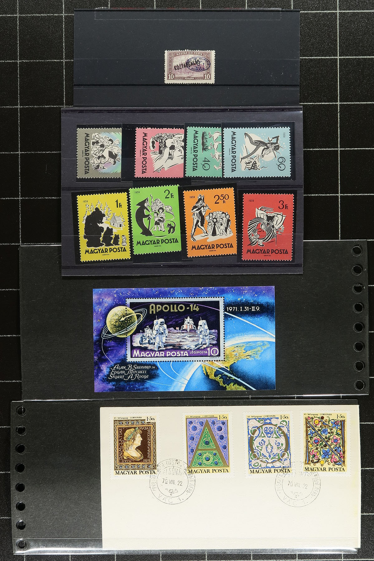 Bankers box with an assortment of albums and stockbooks holding lots of stamps with value and potential. The albums include two "Davo" volumes with pages from 1970-1974 and 1980-1988 (with 400 different stamps between them, and the binders retail at over $100.00 each). On top of that there are a couple of binders with mint collections (one has some nice mint souvenir sheets (e.g. #855b, #C80, #C157, #C166, #1202a), and a couple of stockbooks (16 and 48-page) with a mix of mint and used (pre-1980). A couple of loose items include an interesting overprinted #2N48, which looks good, but forgeries do exist. Estimate =