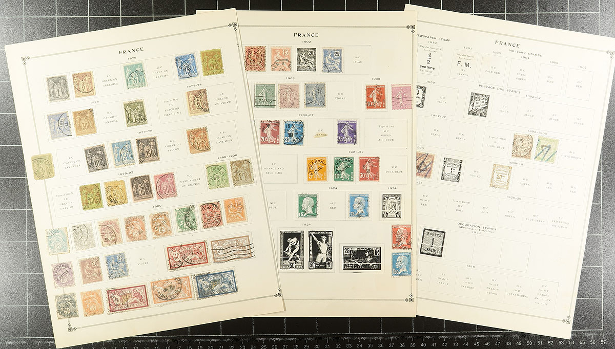 A small, but dense bundle of used French material from the 1850's-2000, with a bit of assorted colonial material. There are parts of five collections still mounted on their original pages. A few stockpages of assorted used were formerly bid board lots, with a small bundle of "102" cards and a freezer bag packed with 200g/8 oz off paper. Expect a bit of mixed condition and some duplication. Estimate =