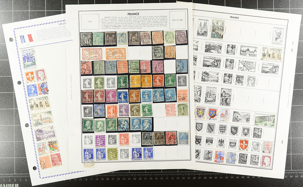 A small, but dense bundle of used French material from the 1850's-2000, with a bit of assorted colonial material. There are parts of five collections still mounted on their original pages. A few stockpages of assorted used were formerly bid board lots, with a small bundle of "102" cards and a freezer bag packed with 200g/8 oz off paper. Expect a bit of mixed condition and some duplication. Estimate =