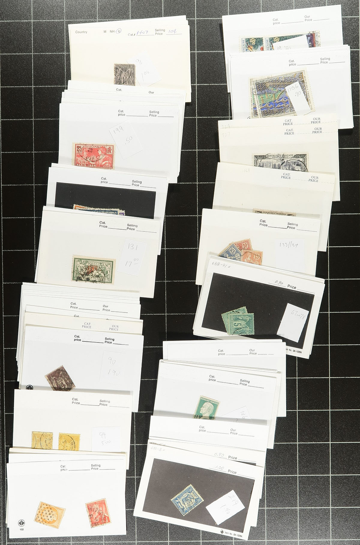A small, but dense bundle of used French material from the 1850's-2000, with a bit of assorted colonial material. There are parts of five collections still mounted on their original pages. A few stockpages of assorted used were formerly bid board lots, with a small bundle of "102" cards and a freezer bag packed with 200g/8 oz off paper. Expect a bit of mixed condition and some duplication. Estimate =