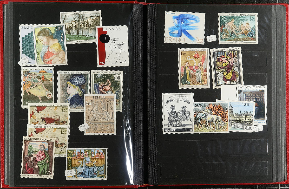 Mint "Art" stamps, plus airmail #C2 (hinge remnant, cat $200.00), and an assortment of 20th century mostly mint in three stockbooks and a double-sided stock page. Generally clean, with a mix of lightly hinged and never hinged. The 32-page stockbooks themselves are something. The red medium-sized "Elephant" is in good condition (a few stickers should remove easily). The pages in the pair of luxurious "Yvert" stockbooks with fabric burgundy covers are fine, but the internal binding is shot (a patient person, using online videos might be able to repair them). Estimate =