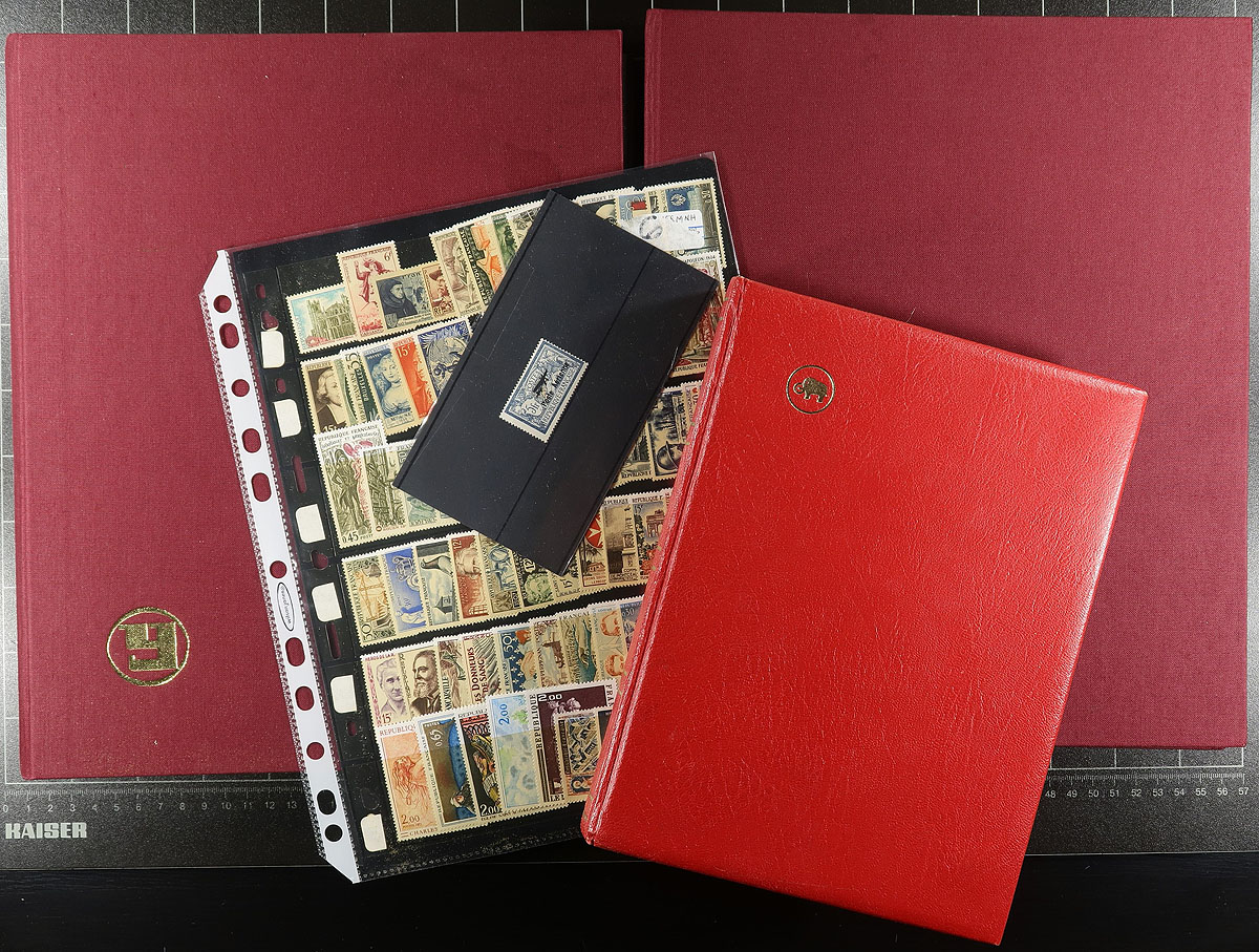 Mint "Art" stamps, plus airmail #C2 (hinge remnant, cat $200.00), and an assortment of 20th century mostly mint in three stockbooks and a double-sided stock page. Generally clean, with a mix of lightly hinged and never hinged. The 32-page stockbooks themselves are something. The red medium-sized "Elephant" is in good condition (a few stickers should remove easily). The pages in the pair of luxurious "Yvert" stockbooks with fabric burgundy covers are fine, but the internal binding is shot (a patient person, using online videos might be able to repair them). Estimate =
