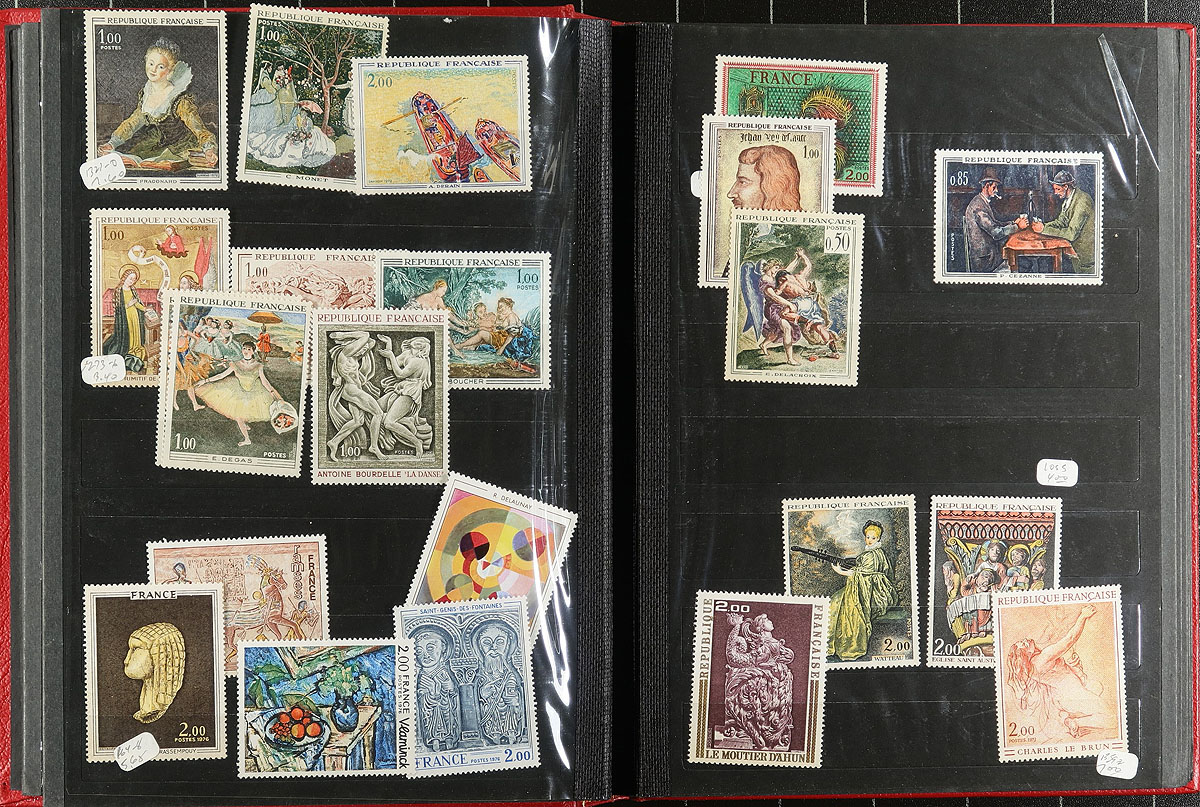 Mint "Art" stamps, plus airmail #C2 (hinge remnant, cat $200.00), and an assortment of 20th century mostly mint in three stockbooks and a double-sided stock page. Generally clean, with a mix of lightly hinged and never hinged. The 32-page stockbooks themselves are something. The red medium-sized "Elephant" is in good condition (a few stickers should remove easily). The pages in the pair of luxurious "Yvert" stockbooks with fabric burgundy covers are fine, but the internal binding is shot (a patient person, using online videos might be able to repair them). Estimate =